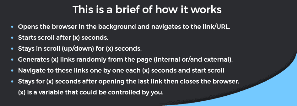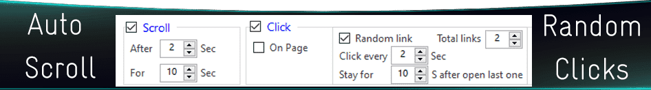 1- Auto Scroll 2- Click on page 3- Random links 4- Bounce Rate.