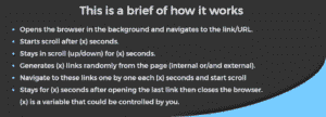 For an old or low specs PC (4g RAM and an old CPU generation) we recommend to increase the delay value (Sequence group) to be 20s at least and decrease the visit duration, e.g. 25 – 35s especially if you want to use the full functionality of this app like:
