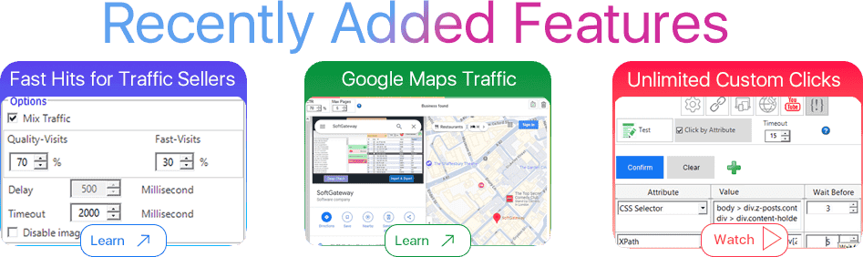 The most popular Windows software to send unlimited Web Traffic to unlimited websites with any automated task you may need: Auto Click, Auto Proxy, Google Maps, Bounce Rate Control and much more.